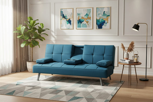 CANAPE CLIC CLAC ( TRANSFORMABLE EN LIT) AVEC PORTE GOBLETS PIEDS CHROME COULEUR BLEU TURQUOISE.168x78x77