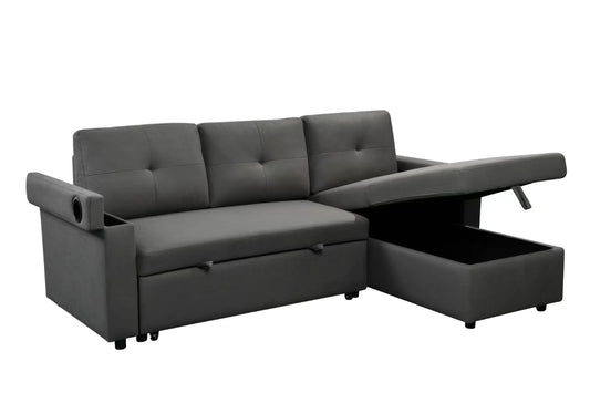 CANAPE D'ANGLE GRIS AVEC PORTE GOBLET TRANSFORMABLE EN LIT AVEC RANGEMENT ET 2 COUSSINS 225x147x84