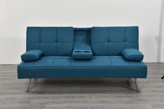 CANAPE CLIC CLAC ( TRANSFORMABLE EN LIT) AVEC PORTE GOBLETS PIEDS CHROME COULEUR BLEU TURQUOISE.168x78x77