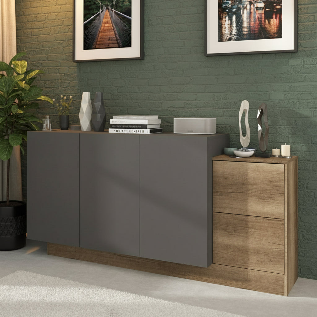 Le buffet L. 180 PARADOXE Gris / imitation chêne allie élégance et fonctionnalité avec son design moderne et ses teintes de gris foncé et imitation chêne.