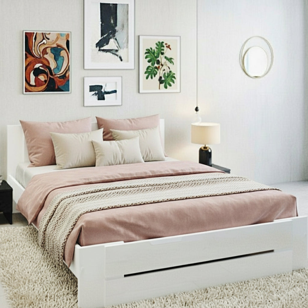 Equipé d’une tête et d’un pied de lit en finition blanc brillant, ce modèle très contemporain vous permettra de relooker votre chambre à petit prix.