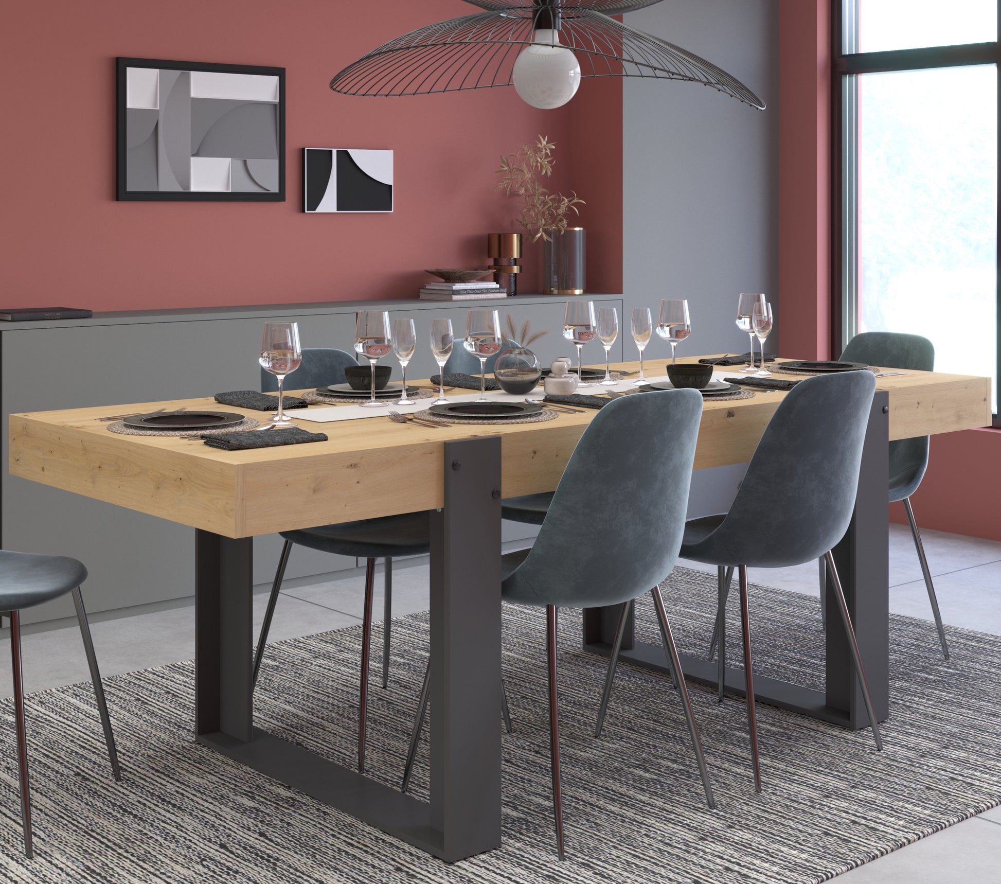 Une table au style industriel, aux montants larges et au décor bi-ton Gris Ombre | Chêne Artisan très tendance